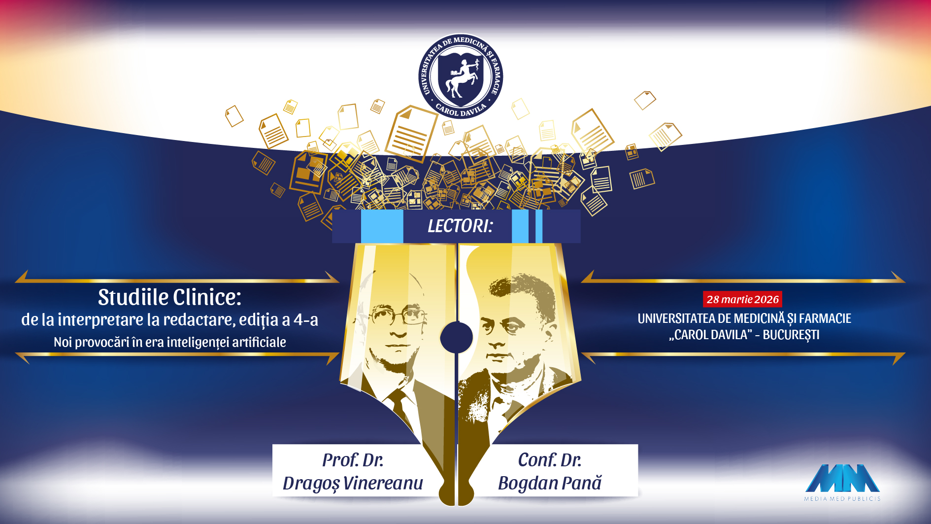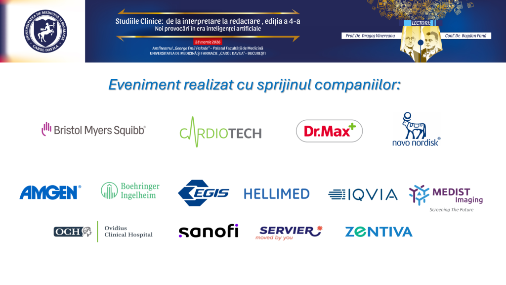 Universitatea de Medicină și Farmacie “Carol Davila” din București are plăcerea de a vă invita să participați sâmbătă, 28 martie 2026, începând cu ora 09:30, la cursul Studiile clinice: de la interpretare la redactare, ediția a 4-a. Noi provocări în era inteligenței artificiale.